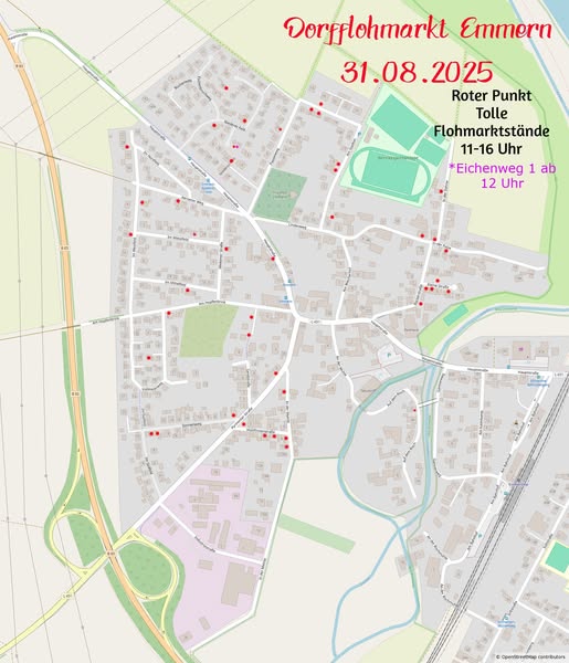 Am kommenden Sonntag, 31. August 2025, wird ganz Emmern zu einem großen Flohmarkt – direkt bei den Verkäuferinnen und Verkäufern zuhause. Im ganzen Dorf bauen Anwohner ihre Flohmarktstände auf. Auf der Karte sind die Verkaufsstellen rot markiert.